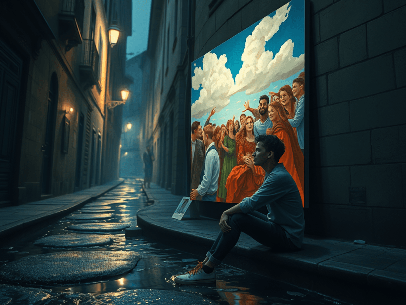 Ahí lo vi por primera vez: la gran pintura que cargaba conmigo. En ella, yo sonreía con una alegría exagerada, rodeado de gente feliz y nubes encendidas en un paisaje inolvidable. Era un cuadro grande, pero no estaba fijo: se movía conmigo. Respiraba. Crecía con el tiempo.